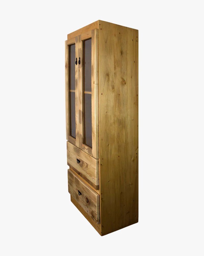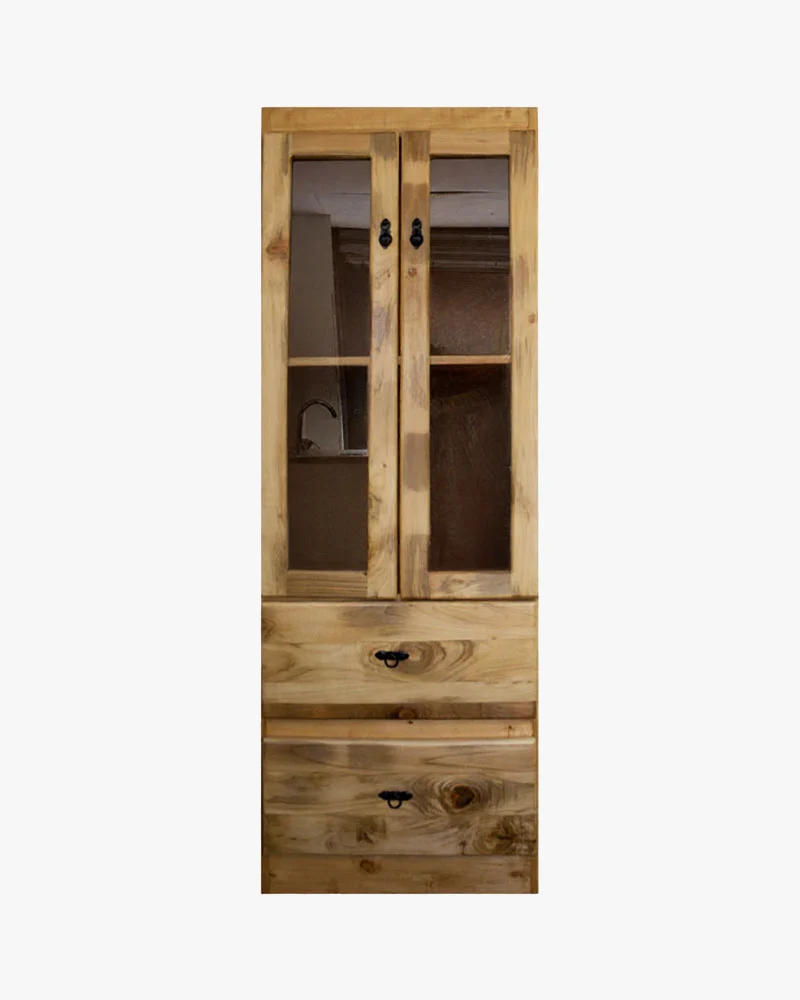 Cuenta con 2 puertas de vidrio que permiten exhibir vajilla, decoración o libros, y 2 cajones inferiores para guardar accesorios y objetos de uso diario. Esta vitrina ofrece un equilibrio perfecto entre funcionalidad y estética.